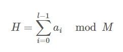 해시 값을 계산하기 위해서 우리는 문자열 혹은 수열을 하나의 정수로 치환하려고 한다. 간단하게는 수열의 값을 모두 더할 수도 있다. 해시 함수의 정의에서 유한한 범위의 출력을 가져야 한다고 했으니까 적당히 큰 수 M으로 나눠주자. 짜잔! 해시 함수가 완성되었다. 이를 수식으로 표현하면 아래와 같다.