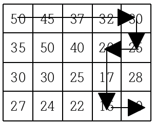 현재 제일 왼쪽 위 칸이 나타내는 지점에 있는 세준이는 제일 오른쪽 아래 칸이 나타내는 지점으로 가려고 한다. 그런데 가능한 힘을 적게 들이고 싶어 항상 높이가 더 낮은 지점으로만 이동하여 목표 지점까지 가고자 한다. 위와 같은 지도에서는 다음과 같은 세 가지 경로가 가능하다.