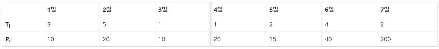 각각의 상담은 상담을 완료하는데 걸리는 기간 Ti와 상담을 했을 때 받을 수 있는 금액 Pi로 이루어져 있다.
