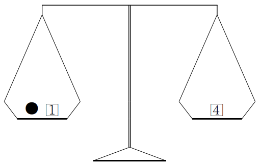 <그림 1> 구슬이 3g인지 확인하는 방법 (1은 1g인 추, 4는 4g인 추, ●은 무게를 확인할 구슬)
