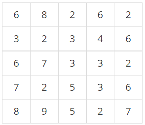 어떤 지역의 높이 정보는 행과 열의 크기가 각각 N인 2차원 배열 형태로 주어지며 배열의 각 원소는 해당 지점의 높이를 표시하는 자연수이다. 예를 들어, 다음은 N=5인 지역의 높이 정보이다.
