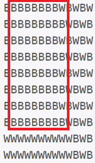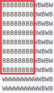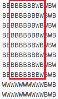 예제 입력 210 13BBBBBBBBWBWBW BBBBBBBBBWBWB BBBBBBBBWBWBW BBBBBBBBBWBWB BBBBBBBBWBWBW BBBBBBBBBWBWB BBBBBBBBWBWBW BBBBBBBBBWBWB WWWWWWWWWWBWB WWWWWWWWWWBWB |