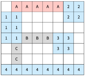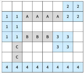 아래 그림은 섬을 모두 연결하는 올바른 2가지 방법이고, 다리는 회색으로 색칠되어 있다. 섬은 정수, 다리는 알파벳 대문자로 구분했다.