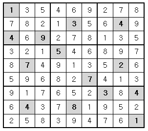 위의 예의 경우, 첫째 줄에는 1을 제외한 나머지 2부터 9까지의 숫자들이 이미 나타나 있으므로 첫째 줄 빈칸에는 1이 들어가야 한다.