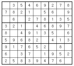 예제 입력0 3 5 4 6 9 2 7 87 8 2 1 0 5 6 0 9 0 6 0 2 7 8 1 3 5 3 2 1 0 4 6 8 9 7 8 0 4 9 1 3 5 0 6 5 9 6 8 2 0 4 1 3 9 1 7 6 5 2 0 8 0 6 0 3 7 0 1 9 5 2 2 5 8 3 9 4 7 6 0 |