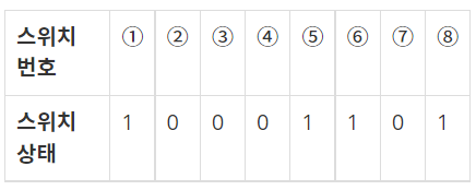 1부터 연속적으로 번호가 붙어있는 스위치들이 있다. 스위치는 켜져 있거나 꺼져있는 상태이다. <그림 1>에 스위치 8개의 상태가 표시되어 있다. ‘1’은 스위치가 켜져 있음을, ‘0’은 꺼져 있음을 나타낸다. 그리고 학생 몇 명을 뽑아서, 학생들에게 1 이상이고 스위치 개수 이하인 자연수를 하나씩 나누어주었다. 학생들은 자신의 성별과 받은 수에 따라 아래와 같은 방식으로 스위치를 조작하게 된다.
