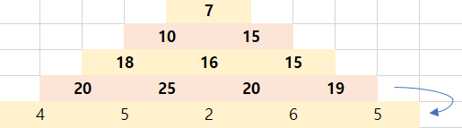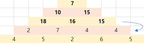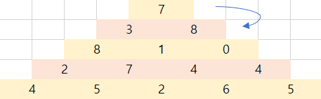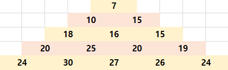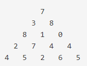 맨 위층 7부터 시작해서 아래에 있는 수 중 하나를 선택하여 아래층으로 내려올 때, 이제까지 선택된 수의 합이 최대가 되는 경로를 구하는 프로그램을 작성하라. 아래층에 있는 수는 현재 층에서 선택된 수의 대각선 왼쪽 또는 대각선 오른쪽에 있는 것 중에서만 선택할 수 있다.