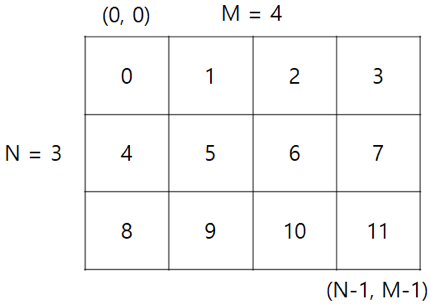 당신은 한화 이글스의 감독이다. 열혈 팬인 욱제의 방문에 깊은 감동을 받은 당신은 욱제가 잃어버린 자리를 찾아주려고 한다. 오늘 경기가 펼쳐지는 잠실구장은 세로 길이가 N, 가로 길이가 M인 N≤M 크기의 관중석을 가지고 있다. 관중석의 왼쪽 위는 (0, 0), 오른쪽 아래는 (N-1, M-1)으로 표시된다. 각 관중석에는 번호가 아래 그림처럼 매겨져있다. (0, 0)에서부터 0번으로 시작하여 오른쪽으로, 끝에 다다르면 그 아래에서 또 오른쪽으로 숫자가 증가해나가는 식이다.