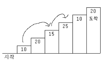 예를 들어 <그림 2>와 같이 시작점에서부터 첫 번째, 두 번째, 네 번째, 여섯 번째 계단을 밟아 도착점에 도달하면 총 점수는 10 + 20 + 25 + 20 = 75점이 된다.