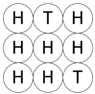 이들 N2개의 동전에 대하여 임의의 한 행 또는 한 열에 놓인 N개의 동전을 모두 뒤집는 작업을 수행할 수 있다. 예를 들어 <그림 1>의 상태에서 첫 번째 열에 놓인 동전을 모두 뒤집으면 <그림 2>와 같이 되고, <그림 2>의 상태에서 첫 번째 행에 놓인 동전을 모두 뒤집으면 <그림 3>과 같이 된다.
