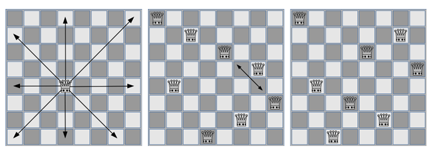 사이나쁜 여왕 퀴즈는 여덟 여왕을 8x8 체스판 위에 배치하는데, 아무도 서로 공격할 수 없도록 배치하는 퀴즈다. 가운데 그림은 올바르지 않은 풀이인데, 두 여왕이 대각선을 통해서 서로 공격할 수 있기 때문이다. 오른쪽 그림은 올바른 해법이다. 우리는 체스판과 여왕의 배치가 주어질 때 해당 배치가 올바른 사이나쁜 여왕 퀴즈의 해법인지 아닌지를 판단해야 한다.