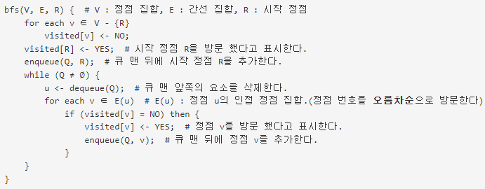 너비 우선 탐색 의사 코드는 다음과 같다. 인접 정점은 오름차순으로 방문한다.