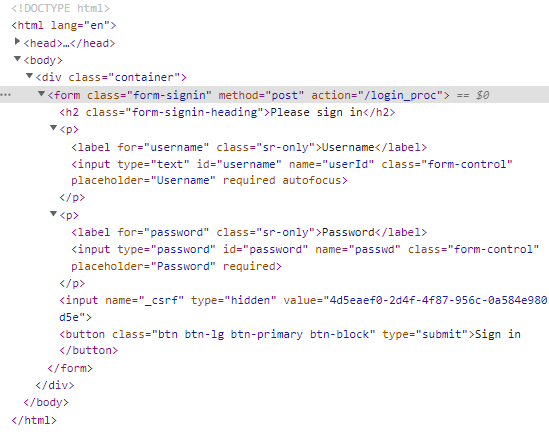 관리자 모드로 Form을 확인해보면 위와 같이 username 파라미터는 userId로, password 파라미터는 passwd로 설정된 것을 확인할 수 있고, form의 action(데이터가 도착할 url) 또한 /login_proc으로 정상적으로 변경돼있음을 확인할 수 있다.