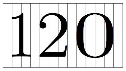 예를 들어 위의 120 같은 경우, 각 숫자 사이에 여백이 1cm 씩 2개 들어간다. 1은 2cm, 2는 3cm, 0은 4cm를 차지한다. 오른쪽, 왼쪽 경계에서 각각 여백이 1cm씩 차지한다. 따라서 총 2 + 2 + 3 + 4 + 1 + 1 = 13(cm) 가 된다.