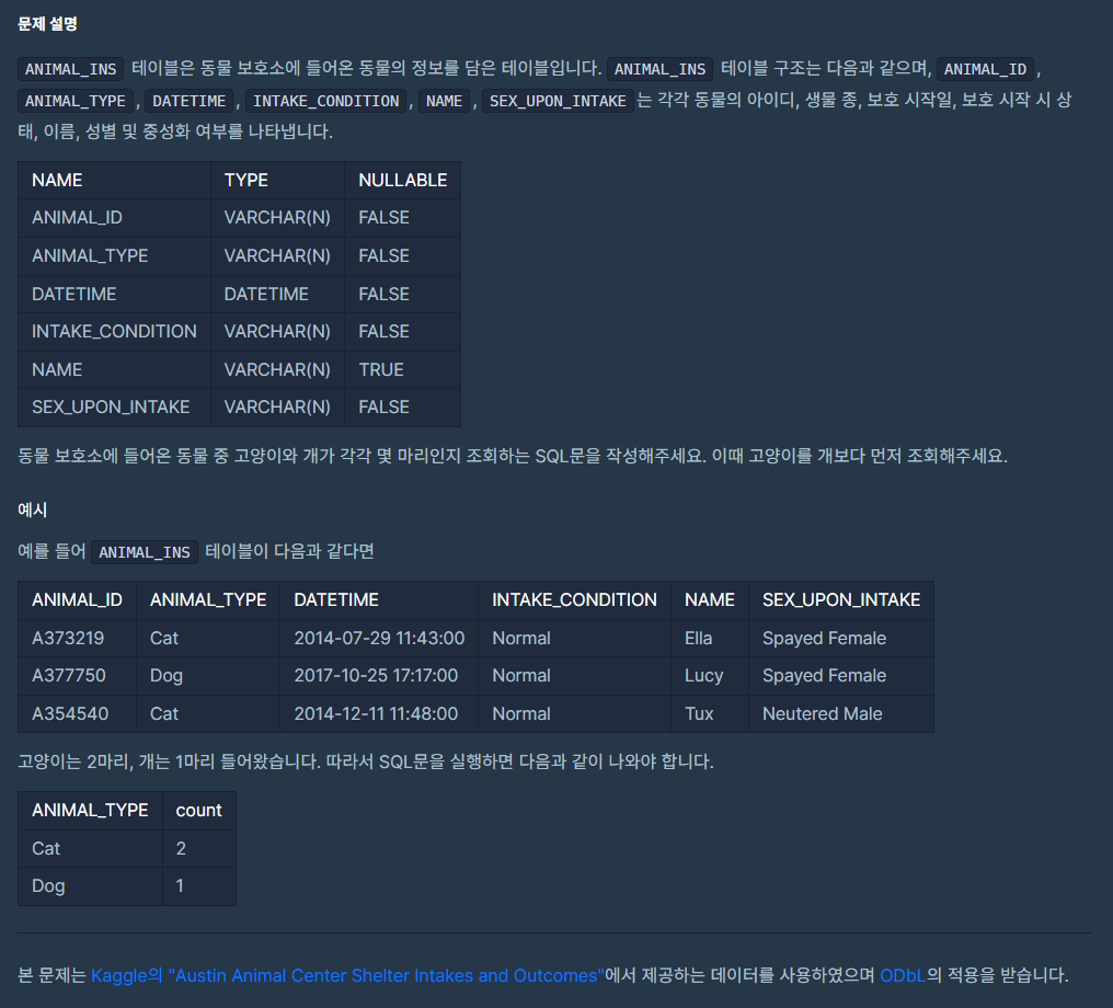 , COUNT(ANIMAL_ID) AS count