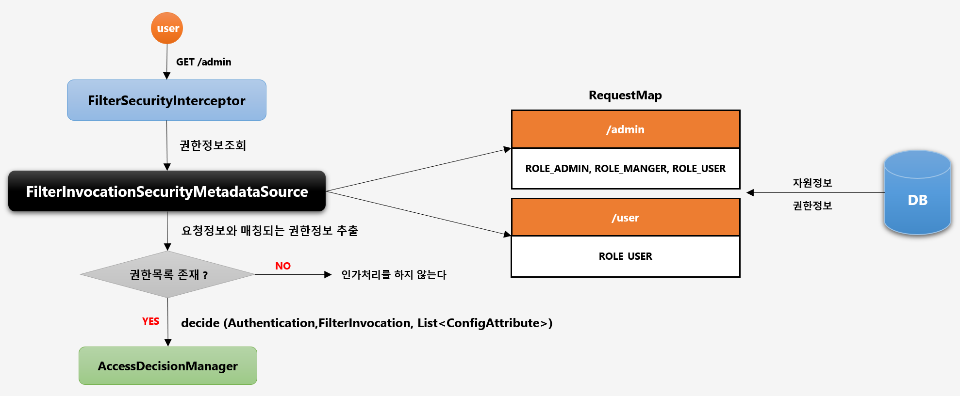 - Spring Security가 초기화될 때, 자원 정보("/user")와 권한 정보(hasRole("User"))를 각각 Key, Value로 Map 객체를 생성하여 저장해둠