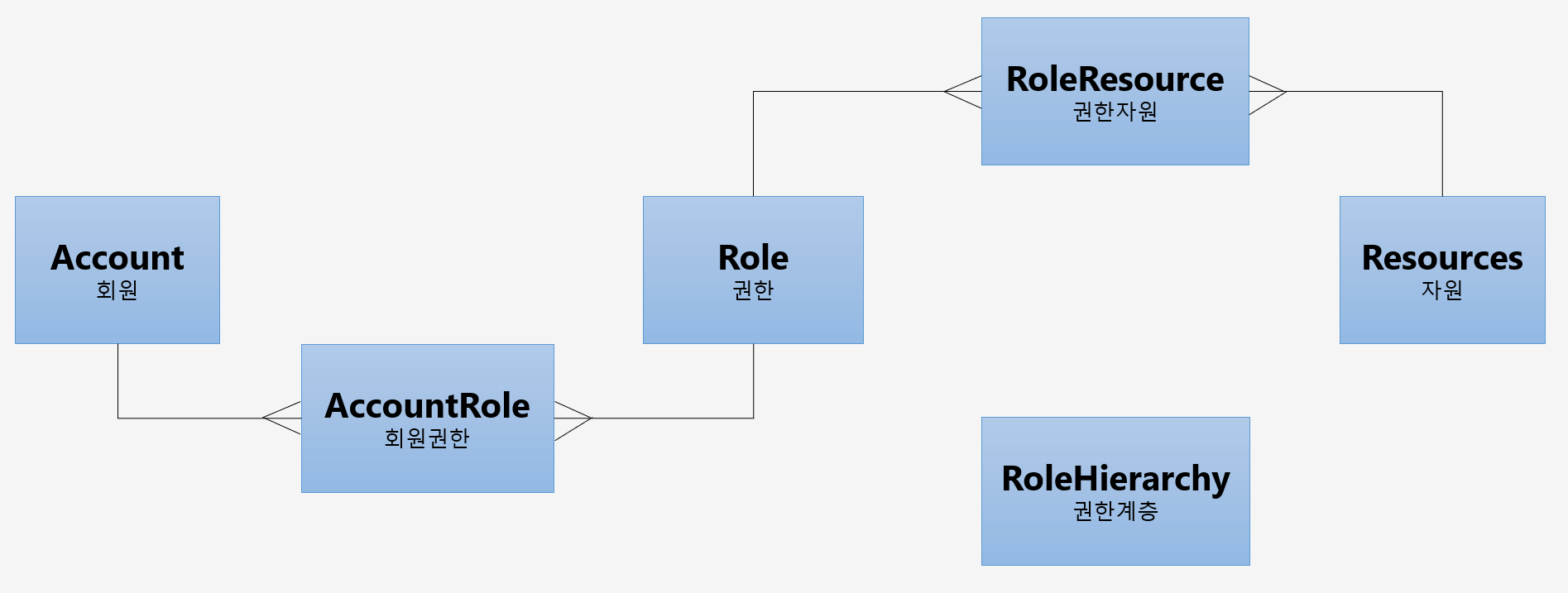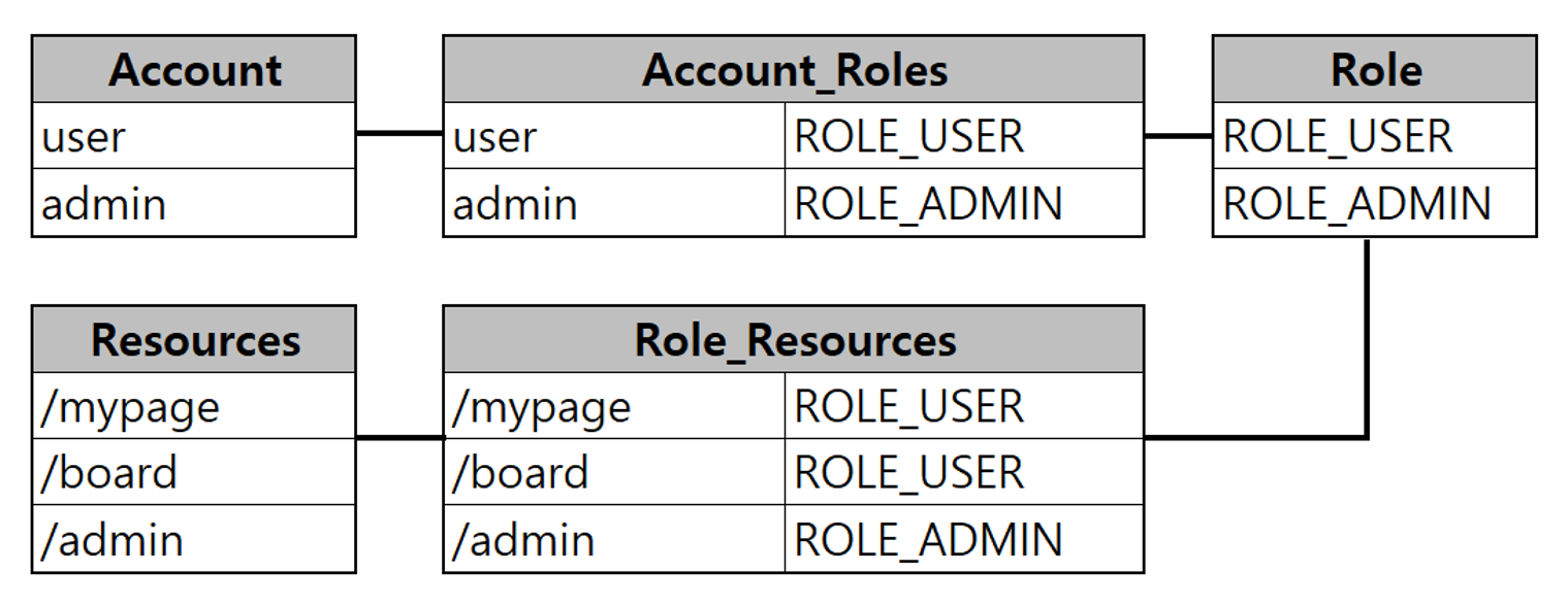 Acount, Role, Resources 각각의 Entity가 1:N 관계로 구성되어 있다.
