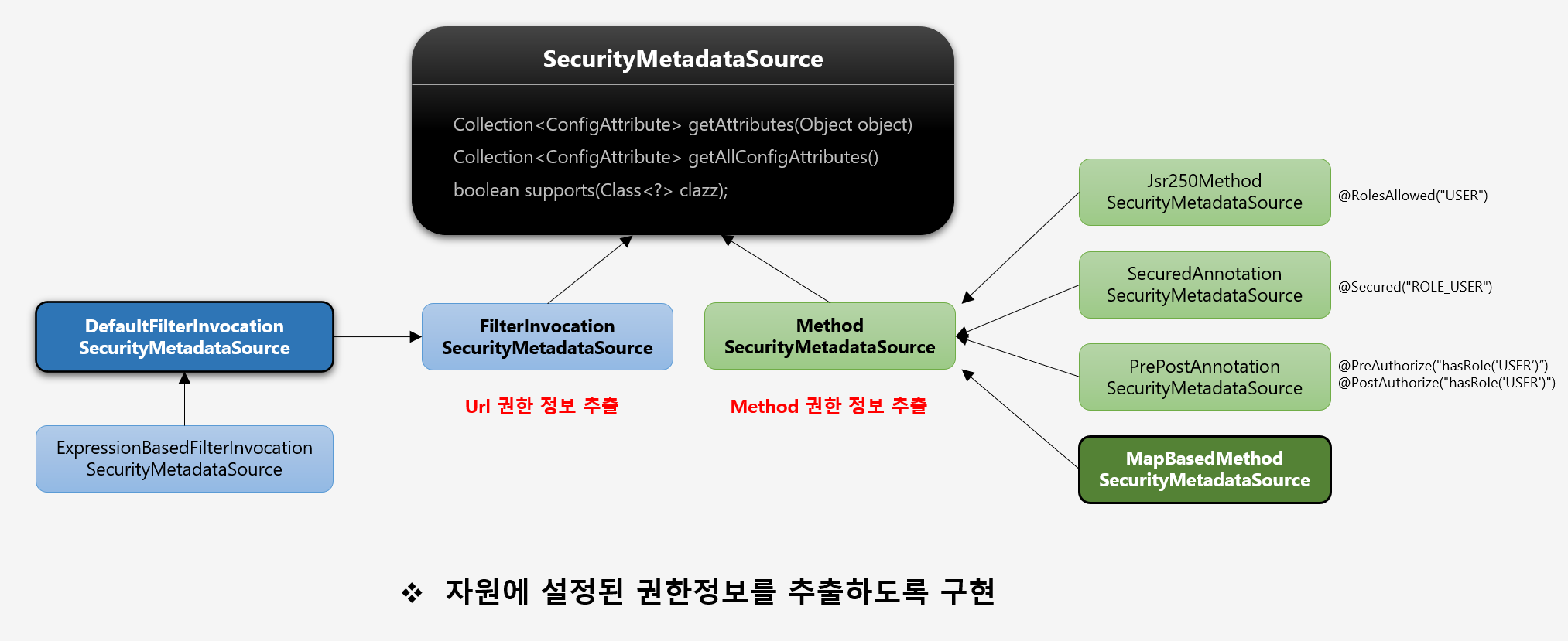 - 이 작업이 진행될 시점은 직접 지정해야 한다. 일반적으로 처음 서버가 기동될 때, 그리고 권한 계층 정보가 바뀔 때 두 가지 시점에 작업이 진행되어야 할 것이다.