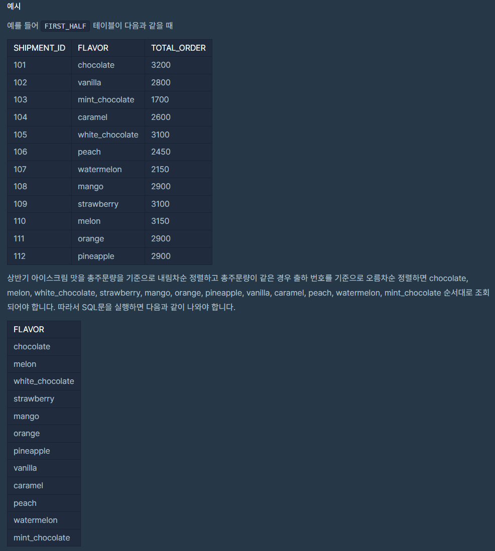 TOTAL_ORDER를 기준으로 내림차순, 같다면 SHIPMENT_ID를 기준으로 오름차순 한 것의 FLAVOR를 조회해야 한다.