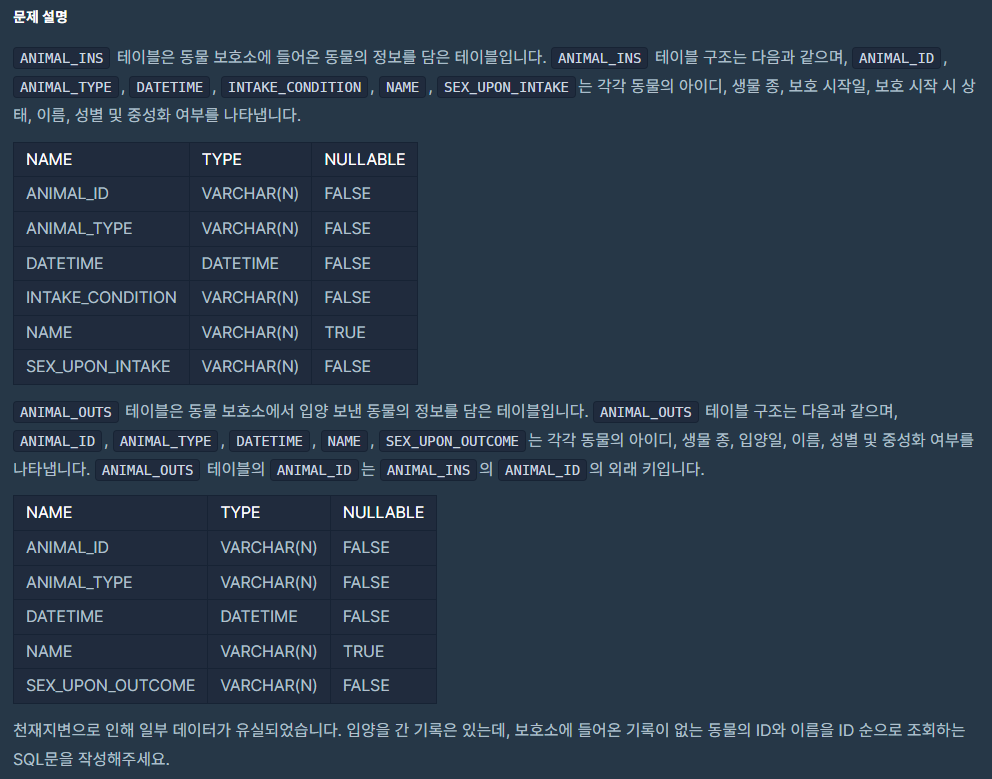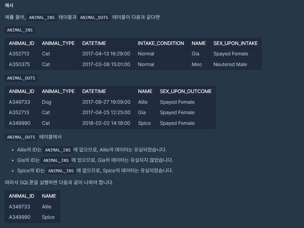 ANIMAL_OUTS 테이블에는 있지만, ANIMAL_INS 테이블에는 존재하지 않는 데이터를 조회해야 한다.