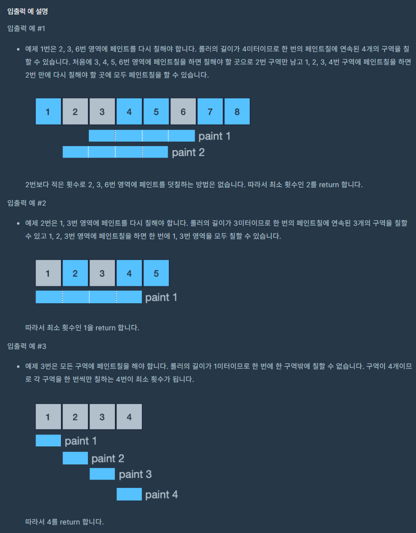 n만큼의 길이의 벽에 한 번에 m만큼의 길이로 페인트칠이 가능할 때, 빈 구역을 모두 칠할 수 있는 최소 횟수를 구해야 한다.