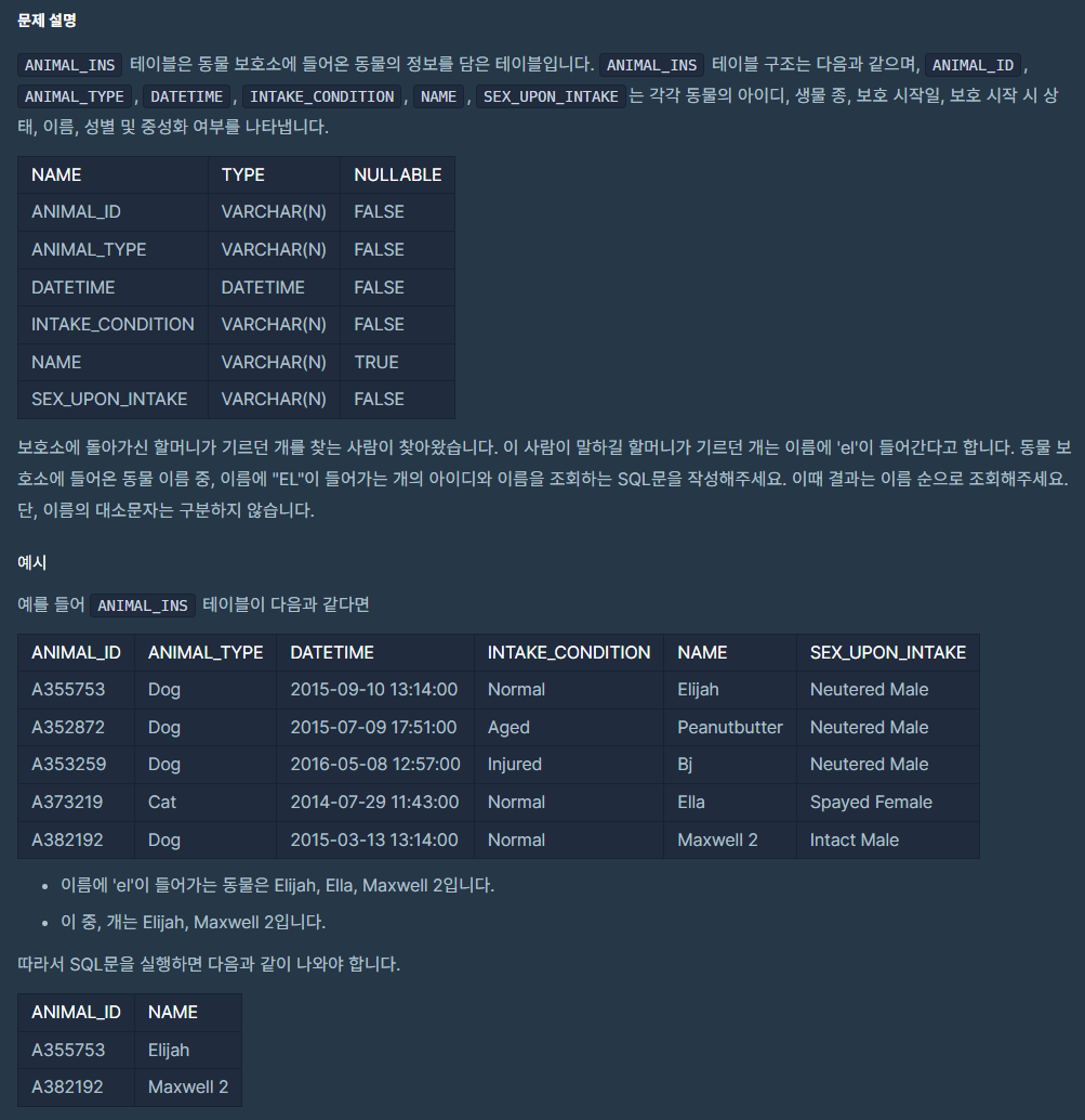 ANIMAL_TYPE이 DOG이면서 이름에 'el'이 들어가는 데이터를 조회해야 한다.