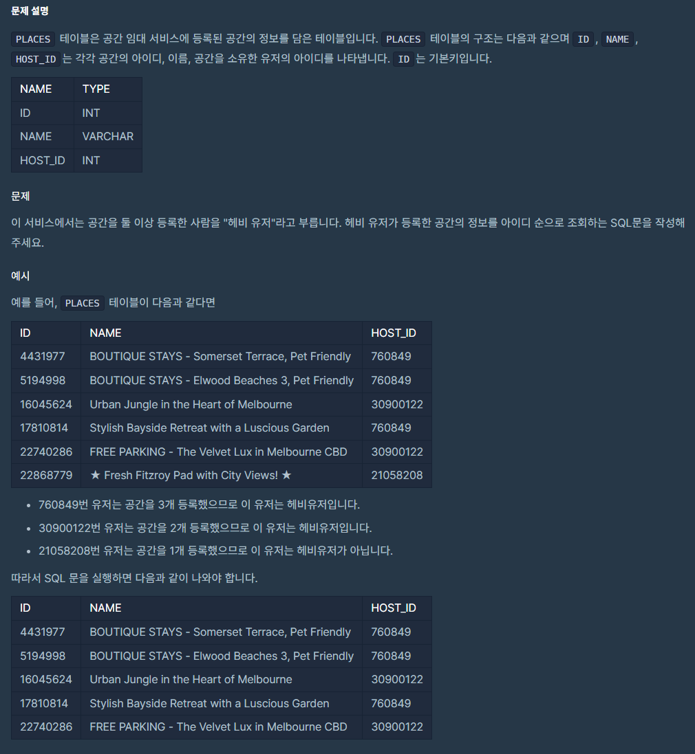 테이블 내에 HOST_ID의 개수가 2개 이상인 데이터들을 조회해야 한다.