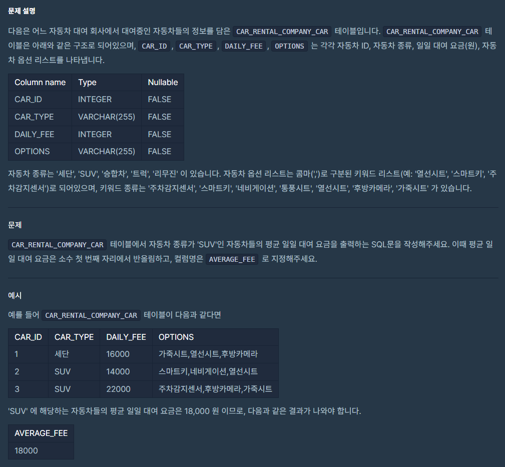 CAR_TYPE이 SUV인 자동차들의 평균 DAILY_FEE를 구해야 한다.