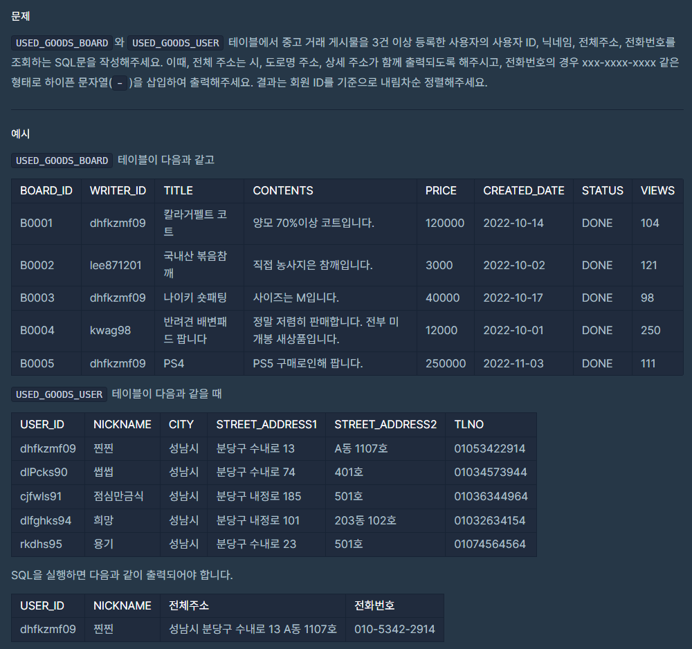해당 조건은 JOIN을 통해 해결한 뒤, 전체 주소와 전화번호를 CONCAT 및 SUBSTRING으로 문제 조건에 맞도록 출력하면 된다.
