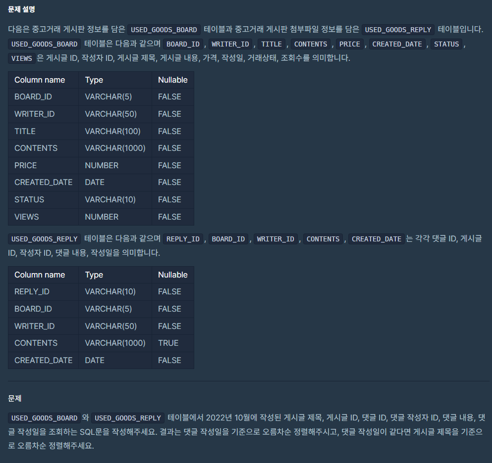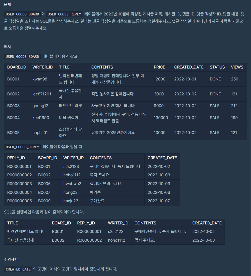 두 테이블을 조인하여 알맞은 컬럼을 SELECT해야 한다. 이 때, 댓글의 CREATED_DATE가 2022년10월인 것을 조회해야 하며, 데이터 형식도 yyyy-mm-dd 꼴이어야 한다. 두 테이블에서 이름이 겹치는 것들이 있는데, 혼동하여 SELECT하지 않도록 주의해야 한다.