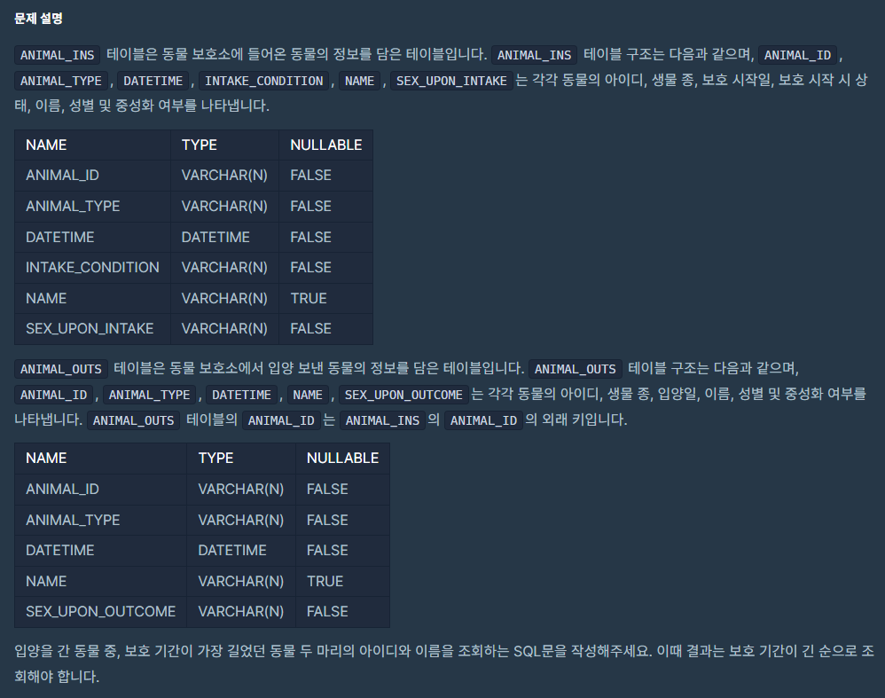 Inner Join을 통해 두 테이블 모두에 존재하는 동물 데이터를 가져온 뒤, 보호소에 들어온 시점과 입양을 간 시점의 차이를 구해 그 차가 큰 순으로 내림차순 정리하면 된다.