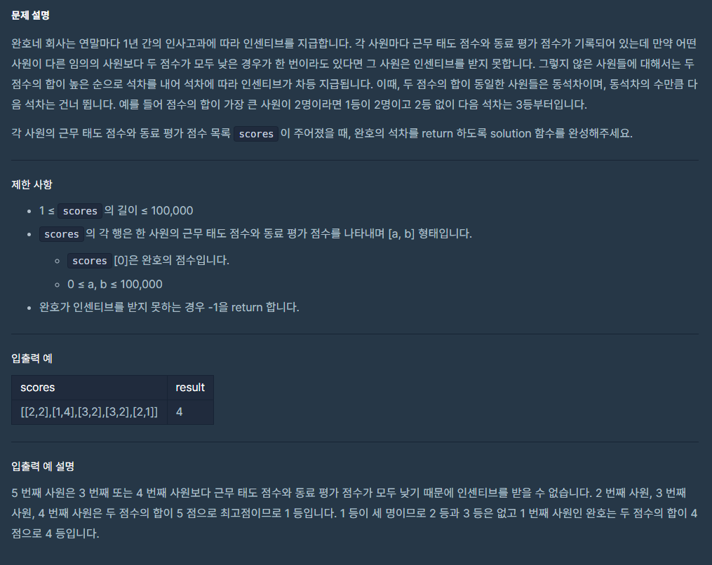 만약 두 점수가 모두 낮은 경우가 있다면 목록에서 제외하며, 이전에 체크했던 사원의 점수로 그 다음 사원을 체크해나간다.