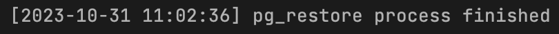 6. 수 분 내에 pg_restore process finished 라는 로그가 뜨면 복원 성공이다. dump 파일을 생성할 때 보다는 시간이 조금 더 걸린다.