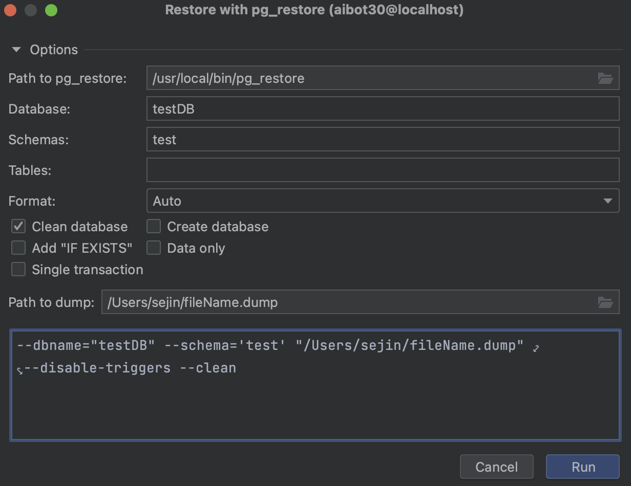 프로젝트를 진행하며 더미 데이터를 검출 후 제거하는 기능이 추가되었고, 이를 테스트할 데이터를 쌓는 일이 필요해졌다. 단, 테스트를 진행하여 데이터를 정제하면 다음 번 테스트를 위해 다시 데이터를 쌓아야 하기 때문에, 스키마를 통째로(데이터 포함) 백업한 뒤 복원하는 것이 좋겠다고 판단했다. 시행착오를 다시 거치지 않기 위해 InteliiJ IDE 환경에서 PostgreSQL의 데이터베이스 및 스키마 백업/복원을 손쉽게 하는 방법을 기술한다.