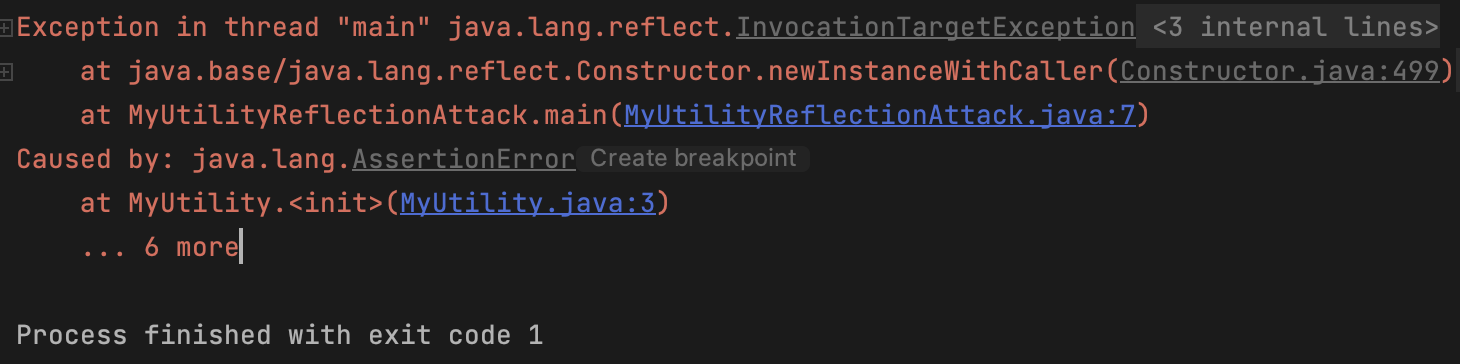 MyUtility 클래스는 private 생성자를 가지고 있고 인스턴스를 가지지 않는 유틸리티 클래스이다. 이를 외부 클래스에서 리플렉션 API를 통해 강제로 인스턴스화를 시도해 보면 아래와 같은 결과를 볼 수 있다.
