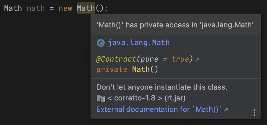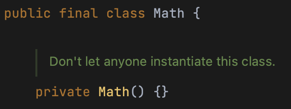 당연하게도 접근 권한 관련 메시지가 뜨며 생성자를 사용할 수 없다는 오류가 발생한다. 클래스 내에서 인스턴스를 생성하는 정적 팩토리를 따로 제공하지도 않기 때문에 Math 클래스를 인스턴스화 할 방법은 없다.