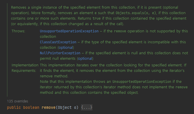 위는 java.util.AbstractCollection 의 remove 메서드에 작성된 API 문서이다. 위의 Implementation Requirements가 바로 메서드의 내부 동작 방식에 대해 설명하는 부분이다. 이 절은 자바 8부터 주석 내부에 @implSpec 태그를 붙여주면 자바독 도구가 생성해준다.