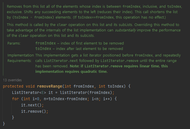 List 구현체의 최종 사용자는 위 메서드에 관심이 없다. 그럼에도 removeRange가 protected로 제공된 이유는 부분리스트의 clear 메서드를 고성능으로 만들기 쉽게 하기 위해서이다. 만약 해당 메서드가 없었다면 하위 클래스에서 clear를 호출할 경우, O(N^2)의 성능을 가지게 되거나 아예 새로 구현해야 했을 것이다.