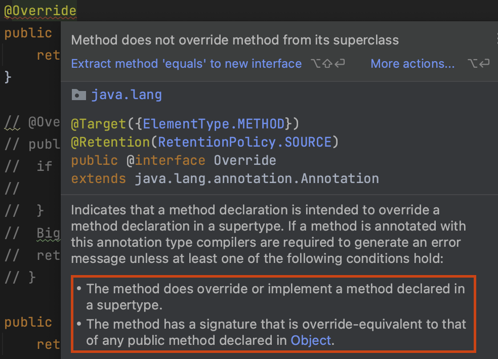 재정의하려는 메서드의 시그니처가 상위 클래스와 다르다는 의미이다. 이렇게 재정의를 하겠다고 @Override를 선언했으나, 문제가 있을 경우 컴파일 타임에서 알려주기 때문에 보다 안전하게 된다. 따라서 equals 의 최종 재정의 코드는 다음과 같다.