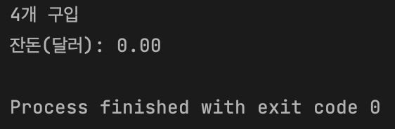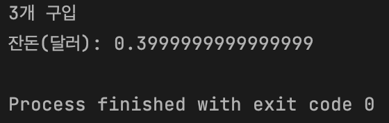 사탕 가격이 10센트씩 증가하는 형태로 선반에 있고, 수중에 1달러가 있을 때 몇 개까지 살 수 있는지를 출력하는 코드이다. 정상적이라면 4개를 구매할 수 있고, 잔돈은 0달러가 될 것이다. 하지만 이를 실행하면 다음과 같은 결과가 나온다.