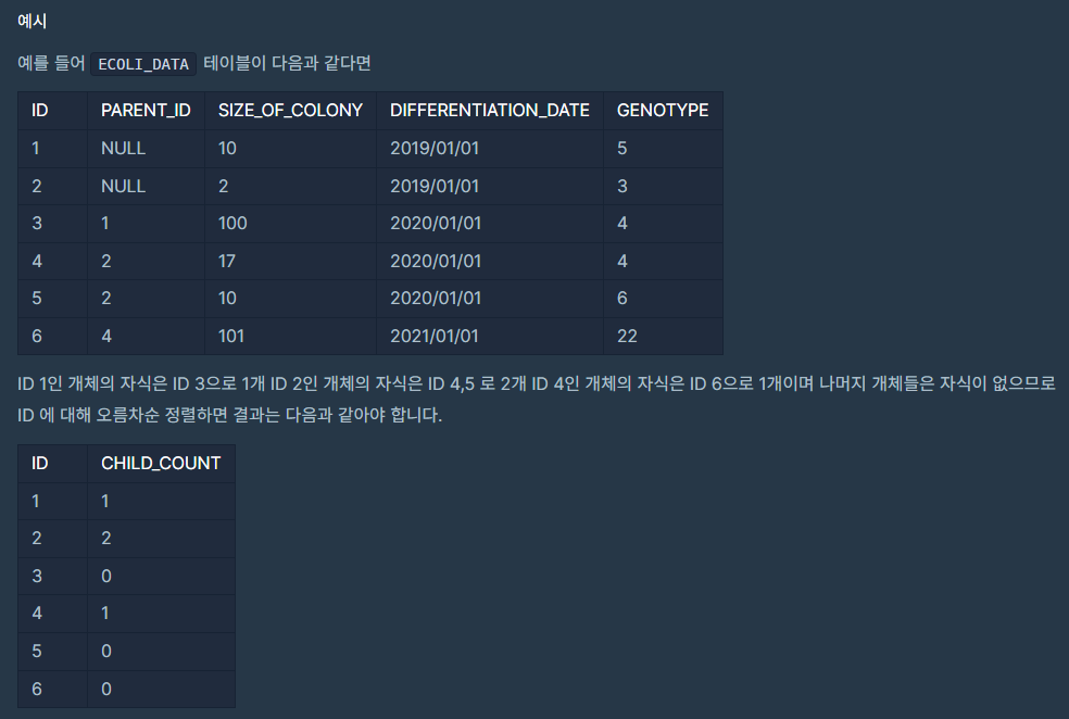 PARENT_ID가 자신의 ID와 일치하는 행의 개수를 세 CHILD_COUNT 컬럼과 함께 출력해야 한다.
