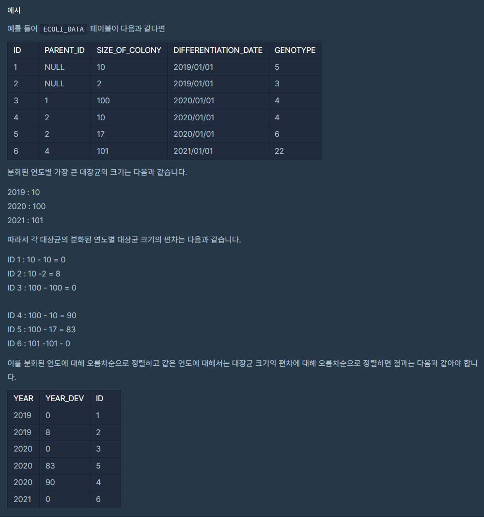 각 연도별 최대 대장균 크기를 구해, 현재 연도 ID의 대장균 크기 값을 뺀 것을 YEAR_DEV로 출력해야 한다.