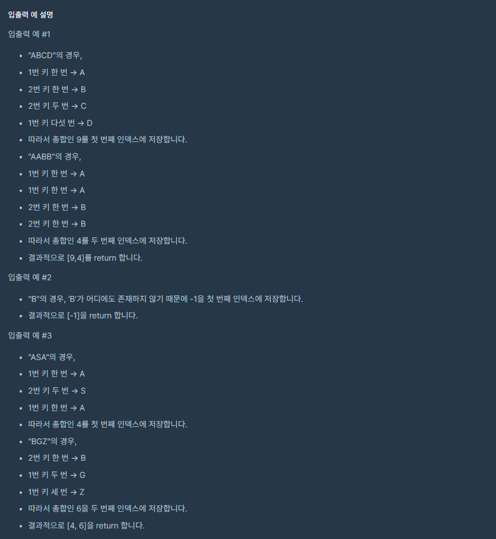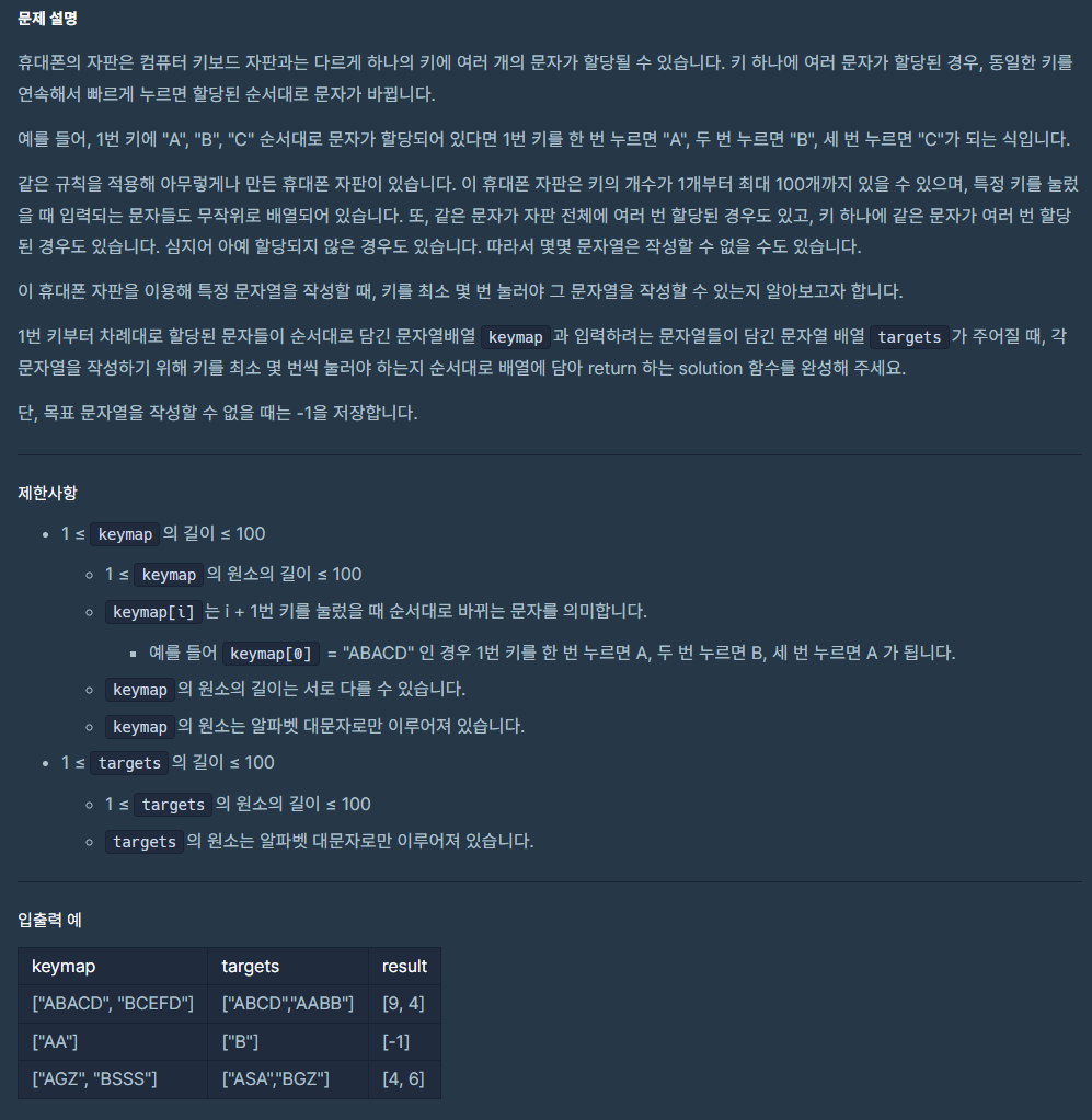 따라서 주어진 자판을 순회하며 알파벳마다 가장 빨리 누를 수 있는 횟수를 딕셔너리에 기록한다. 이후, targets의 문자열을 순회하며 딕셔너리를 이용해 문자열을 입력할 수 있는 가장 짧은 입력 횟수를 구한다.