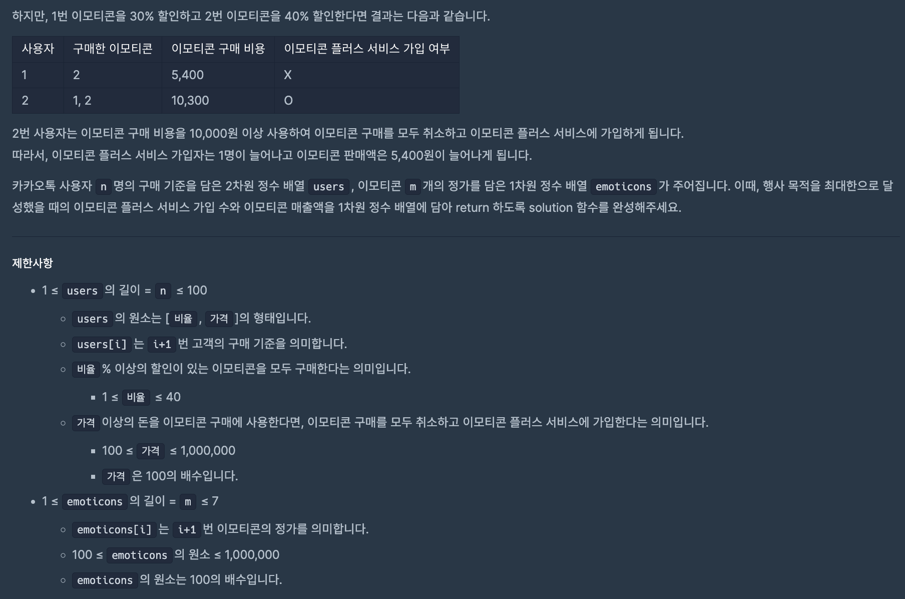 각 이모티콘의 할인율을 적절하게 정하여 최대의 이모티콘 플러스 가입자를 유치하고, 그 때 최대의 이익을 출력해야 한다.