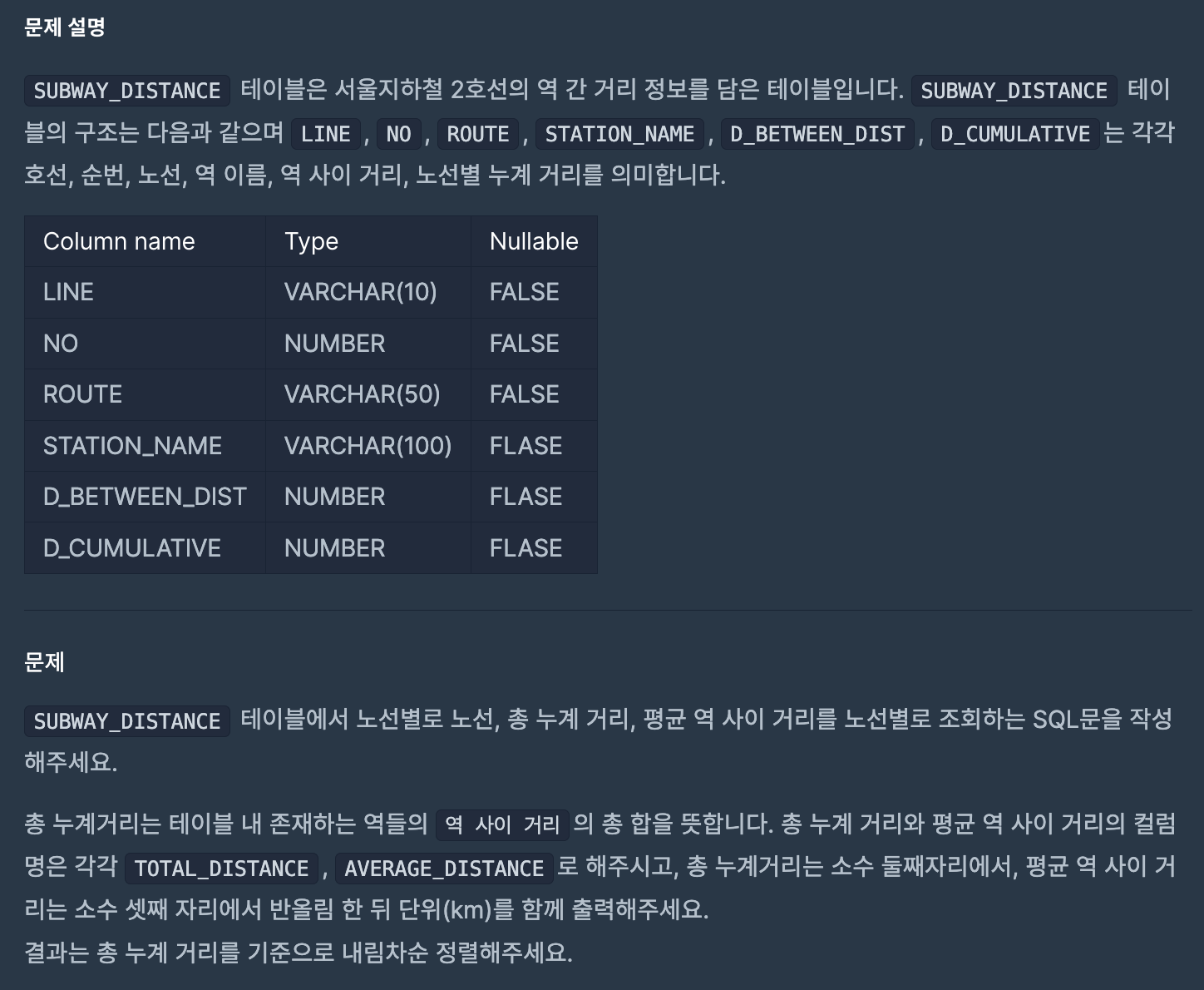 주의해야 할 점은 총 누계 거리를 기준으로 내림차순 정렬을 해야 하는데, TOTAL_DISTANCE를 그대로 정렬 기준으로 삼는다면 문자열이기 때문에 정확한 크기 비교가 되지 않는다. 따라서 문자열 형태가 아니라 숫자 형태로 비교를 해야 한다.