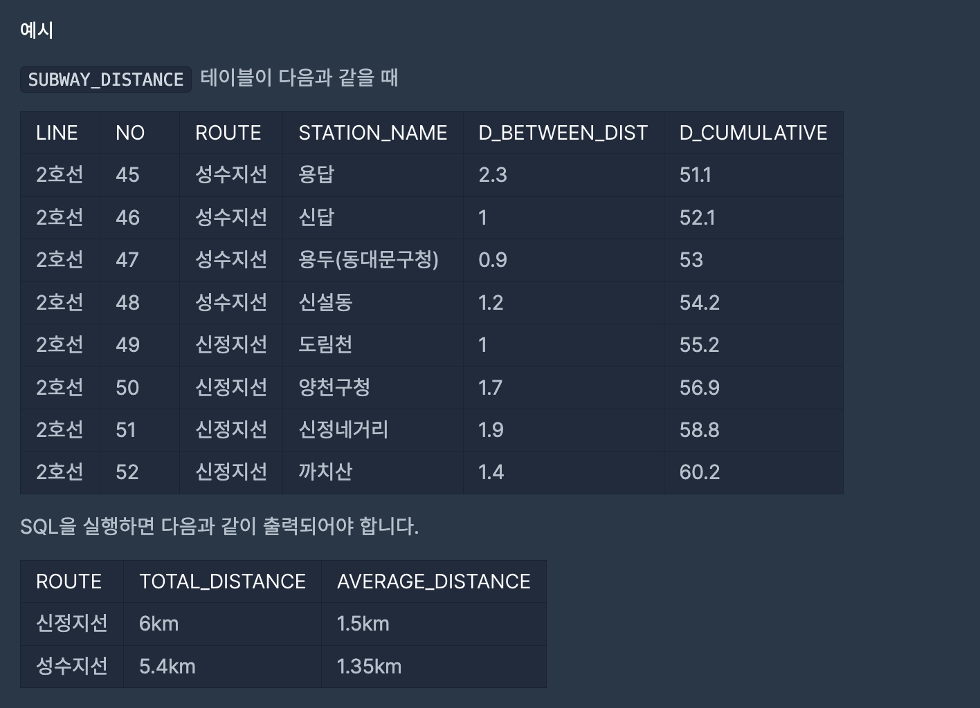 노선별로 총 거리와 평균 거리를 반환해야 한다.