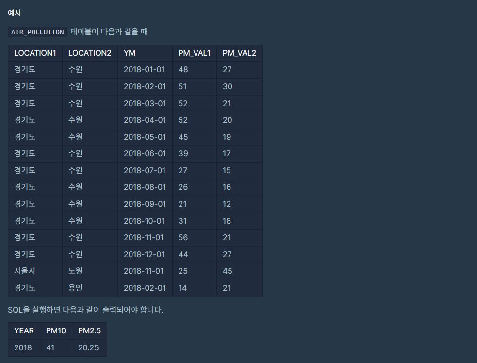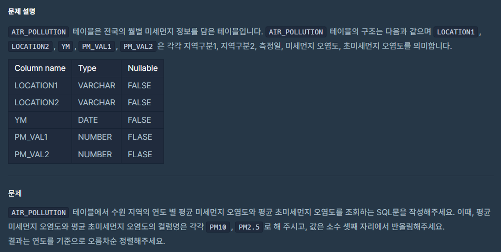 수원 지역의 미세먼지 농도를 연도를 기준으로 묶어 평균값을 출력해야 한다.
