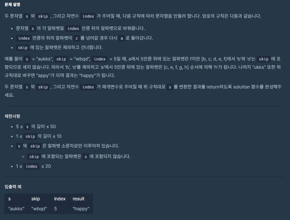 - s를 순회하며 skipped에서 현재 알파벳의 인덱스를 찾아 index 만큼 더해준다. 이 때, skipped 의 총 길이를 초과한다면 그 나머지를 구한다.