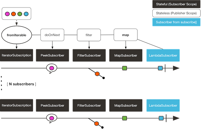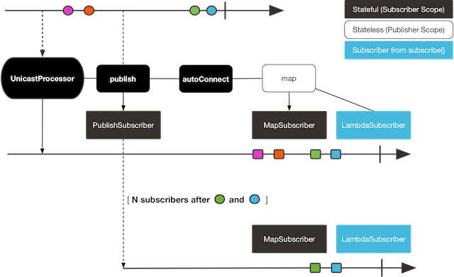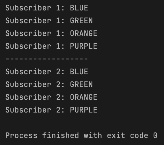 위의 마블 다이어그램을 살펴 보면 맨 윗 줄은 데이터를 emit 하는 Publisher, 가운데와 아랫 줄은 각각 Subscriber1, 2에 해당한다. 처음부터 구독한 Subscriber1은 모든 데이터를 전달 받은 것에 반해 중간부터 구독한 Subscriber는 데이터를 두 개만 전달받은 것을 확인할 수 있다.