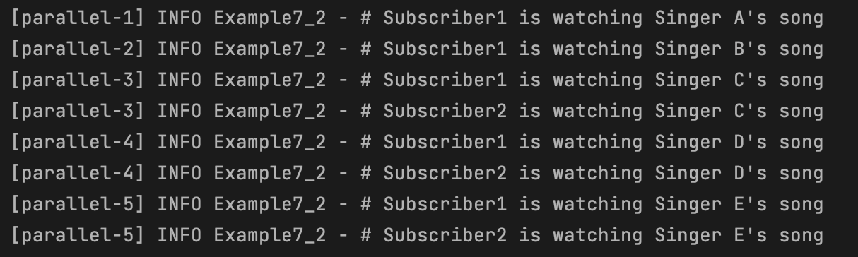 또한 delayElements() Operator의 디폴트 스레드 스케줄러가 Parallel이기 때문에 위 로그에서 parallel 스레드로 실행된 것을 확인할 수 있다.